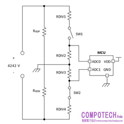 由於開關 (SW1、SW2) 常為配備整合式金屬氧化半導體場效電晶體的固態繼電器或光繼電器,您必須進行元件考量以確保開關存活率。這些開關通常在一段時間內額定為有限崩潰電流 (Iava) 量,例如在選擇元件時,您可能需選擇串聯電阻器來適當限制崩潰電流,或在接地中加入昂貴的磁簧繼電器,以避免崩潰電流聚集在一起。但大型串聯電阻器會對量測準確性造成負面影響,因此選擇電阻值與絕緣電阻相似的電阻器,將可提高準確度。