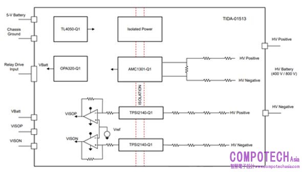 高電壓電動車充電和太陽能隔離監控 AFE 參考設計和車用高電壓與隔離洩漏測量參考設計皆採用 TPSI2140-Q1 固態繼電器進行已知電阻切換。