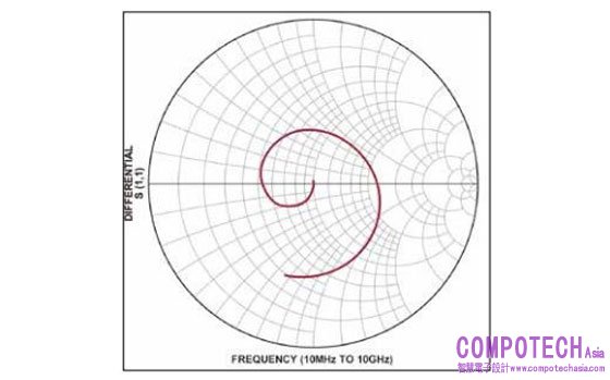 圖: 由於矽片和封裝的寄生效應,AD9081 ADC 輸入阻抗隨頻率變化明顯 ( 史密斯圓圖以 100 Ω 為參考 )
