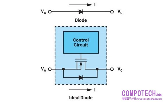圖1顯示了採用N通道功率MOSFET的基本理想二極體。將MOSFET放置在適當的方向,使其本體二極體與要模擬的二極體功能方向相同(上方)。當VA高於VC時,電流可以自然地從左向右流過本體二極體。當電流沿該方向流動時,控制電路使MOSFET導通,以減小正向壓降。當VC高於VA時,為了防止電流反向(從右到左)流動,控制電路必須將MOSFET快速關斷。理想二極體的壓降很低,由MOSFET的RDS(ON)和電流大小決定。例如,在1 A負載下,10 mΩ MOSFET的端子會產生1 A × 10 mΩ = 10 mV的壓降,而常規二極體的典型壓降為600 mV。理想二極體的功耗為1 A2 × 10 mΩ = 10 mW,明顯低於常規二極體的1 A × 600 mV = 600 mW(典型值)。