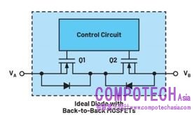 得益於MOSFET技術的進步,現在出現了低RDS(ON)的MOSFET。如果在理想二極體解決方案中增加背靠背MOSFET,雖然會使壓降略微增加,但也會帶來許多系統控制功能。圖2顯示了此電路概念。