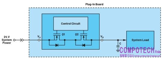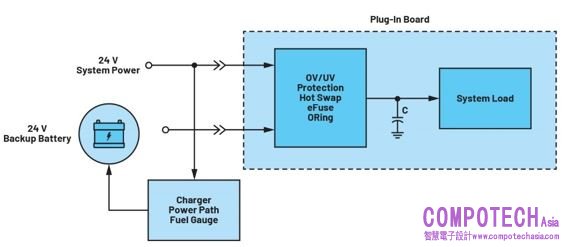 如圖3所示,當電路板插入背板(主系統電源和備用電池所在的板)時,系統板需要熱插拔功能來限制為輸入電容C充電時的湧浪電流。此種熱插拔功能透過感測和控制流過圖2中Q2的電流來實現。