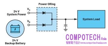 圖4展示了電源ORing概念。為提供簡單說明,這裡使用二極體符號取代理想二極體電路。在如此簡單的ORing配置中,電壓較高的電源占主導地位並為負載供電,另一個電源處於待機狀態。如果兩個電源具有不同的電壓值,該解決方案會很有效。當兩個電壓彼此接近時,或者當存在電壓波動而導致電壓值交叉時,電源可能會來回切換。