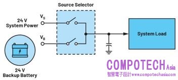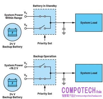 在此用例中,簡單的ORing功能是不夠的,原因有二。首先,電池電壓與系統標稱電壓24 V差不多。兩個電源可能會來回切換,這是我們不希望看到的。源阻抗和負載電流的影響進一步放大了這個問題。例如,當VS為負載供電時,負載電流會在VS源阻抗兩端產生壓降,使其端電壓降至略低於電池端電壓(當前空載)的水準。電池隨即接通,現在承載負載電流,這同樣會在電池阻抗兩端產生壓降,導致電池端電壓下降。同時,在無負載情況下,主電源端電壓升高,使得VS試圖接管。在此種情況下,就會在兩個電源之間持續振盪直到兩個電壓彼此偏離為止。