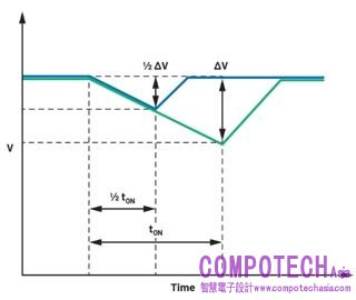 在沒有備用電池的系統中(圖8),電容C提供備用電源,通常稱其為保持電容。在此種配置中,VS上的瞬態過壓條件會觸發Q2(圖8)關斷。電容提供必要的電力以保持系統運行,同時其電壓因放電而下降。當VS回到正常工作範圍時,Q2重新導通。Q2重新導通的時間tON必須很短,使電容壓降盡可能低。圖9顯示了一個相對比較結果,在保持電容量相同的情況下,一半tON可將壓降降低一半。