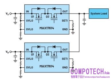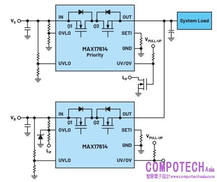 我們研究了不同功能,如源選擇器、熱插拔、eFuse、UV/OV和關鍵規格,目的是防範常見的系統故障,增強系統穩固性。使用許多單一功能IC來實現所有這些功能會很麻煩。此種解決方案很複雜,需要許多元元件。 MAX17614 是一款全新的高整合度解決方案,透過單一IC即可實現高性能理想二極體功能以及許多其他功能,進而為電源系統提供全面保護。該元件的工作電壓範圍為4.5 V至60 V,提供3 A輸出,具有理想二極體/優先電源選擇器功能,以及可調限流、熱插拔、eFuse、UV和OV保護功能。圖10和圖11分別顯示了MAX17614在ORing應用和優先電源選擇器應用中的簡化原理圖。