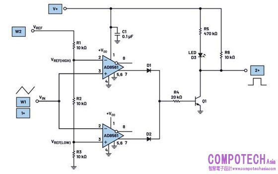 如果VIN高於電壓上限,即VREF(HIGH)等於2/3 VREF,此時輸出將為高位準,D1將正向偏置。由於NPN電晶體基極為正電壓,Q1進入飽和狀態。因此,輸出電壓為零,供電電壓在R5和D3上產生壓降,進而點亮LED。