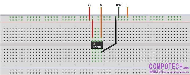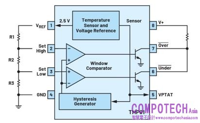 TMP01為一款線性電壓輸出溫度感測器,具有一個視窗比較器,使用者可以對其進行編程設定,當超過預定溫度設定點電壓時就會啟動兩個開集輸出之一。可以使用低漂移基準電壓源來設定設定點,將兩個開集輸出連接在一起作為單線「或」輸出,我們便可獲得一個訊號——當環境溫度在目標視窗內時,該訊號為邏輯高位準。