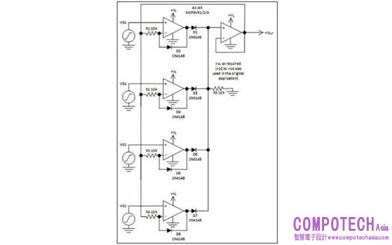 圖 1: 輸入優先順序放大器提供的輸出對應的是四個輸入中具有最大正值的一個。雖然該電路回應正輸入,但透過反轉二極體的方向和重新配置電源即可回應負輸入。