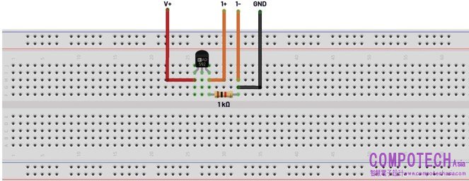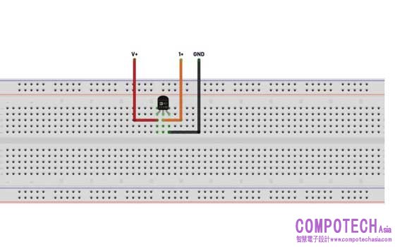 對於溫度測量,需要將感測器連接到電源,將輸出連接到示波器。圖2顯示了無焊試驗板上的感測器連接。
