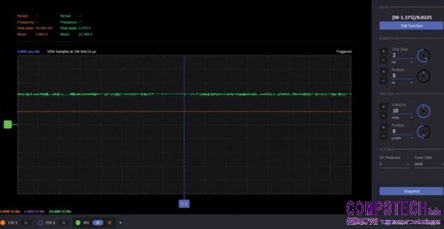 要在示波器工具上顯示溫度,請添加一個新的數學通道,並使用程式4作為函數。請記住,通道1電壓以mV為單位,感測器的輸出電流以μA為單位。這意味著,如果您想在通道M1上獲得溫度,必須將通道CH1上讀取的值減去0.273。
