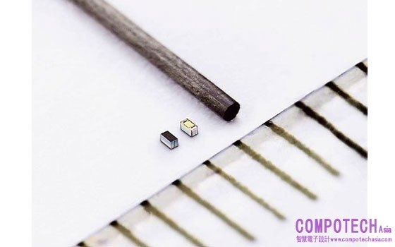 照片1:矽電容“BTD1RVFL”產品照片(與0.5mm自動鉛筆芯比較)
