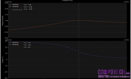 重新打開電源,並運行單次頻率掃描。您應該會看到,幅度和相位與頻率的關係曲線和模擬結果相似。一旦確定放大器的最大增益出現在350 kHz附近,就可以縮小頻率掃描範圍,使其從100 kHz開始,到1 MHz停止。