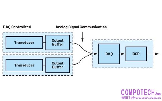CM系統由多個感測器或變換器組成。許多系統採用集中式系統架構,每個感測器透過類比電纜連線到DAQ解決方案的一個通道或輸入1。