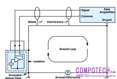 例如,如果(1)感測器有一條接地路徑,(2)DAQ也有另外一條接地路徑,並且(3)電纜遮罩層從兩側接地,則會形成接地迴路(圖4)。接地迴路讓電流可以沿著遮罩層流動。因此,遮罩層上來自電源線和附近機械的感應電流可能會將干擾耦合到訊號線 上。為了正確接地,理想情況下從系統中的任何點到地應該只有一條低阻抗路徑。接地系統設計需要考慮應用、環境和感測器的隔離類型。