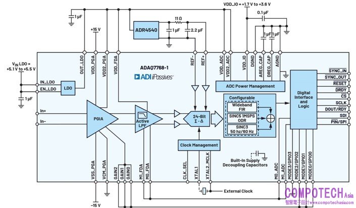 ADAQ7768-1內建一個全差分PGIA。由於具有高阻抗和低輸入偏置電流,其可直接連接到各種感測器。不同於傳統的電壓回饋放大器,整合PGIA在所有增益設定下保持幾乎相同的頻寬,無論增益如何設定都能實現嚴格的元件間相位匹配。