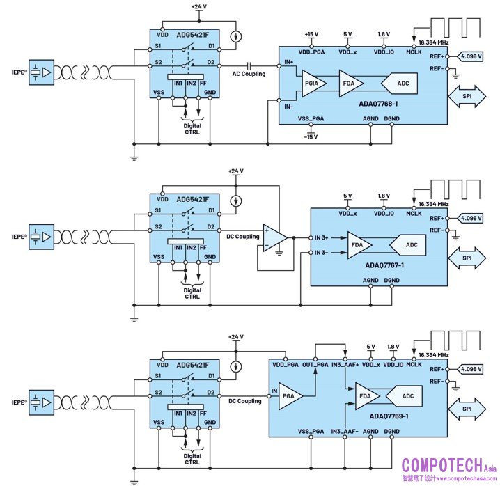 圖11. 與IEPE感測器一起使用的各種ADAQ776x-1大類產品