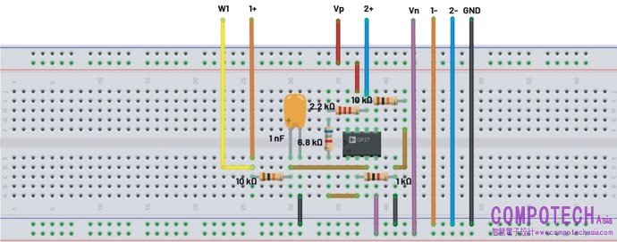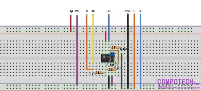 建構圖6所示的試驗板電路。將正電源設定為+5 V,將負電源設定為-5 V。
