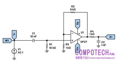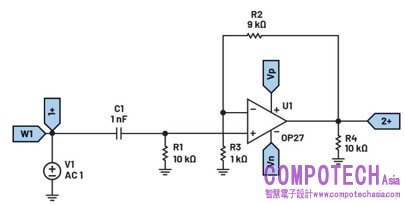 建構圖9所示的主動高通濾波器電路。使用ADALM2000的正負電源。
