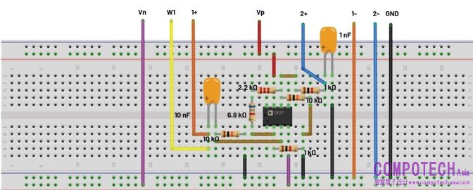 圖3. 具有增益控制的主動低通濾波器試驗板連接