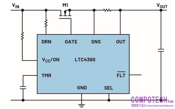 可靠的工業電子設備通常配備保護電路,以防止電源線路出現過壓,進而保護電子設備免受損壞。過壓現象可能在電源線路負載快速變化時發生,線路中的寄生電感可能導致高電壓尖峰。這個問題可透過輸入保護電路來解決,例如圖1所示採用 ADI LTC4380的保護電路。在該電路中,功率開關M1位於電流傳導路徑上。當 VIN時發生過壓時,開關M1將在線性區域內工作,使其表現為歐姆區域的電阻,進而透過MOSFET M1上的壓降來調節 VOUT 。此一機制可有效防止輸出電壓升高至過高水準,進而保護下游電子設備。然而,這種保護方法的有效時間是有限的,持續時間由開關M1的許可安全工作區(SOA)決定。如果功率MOSFET上的壓降一直很高且持續時間超過了限制,MOSFET的溫度將超過其最高溫度閾值,可能導致元件損壞。LTC4380等積體電路內建了計時器以防止過壓情況的發生。計時器中設定了MOSFET在過壓條件下在線性區域工作的時間,通常為數毫秒或數微秒。一旦設定時間結束,開關M1將完全斷開,進而保護開關本身,但這也表示系統的電源將被切斷。