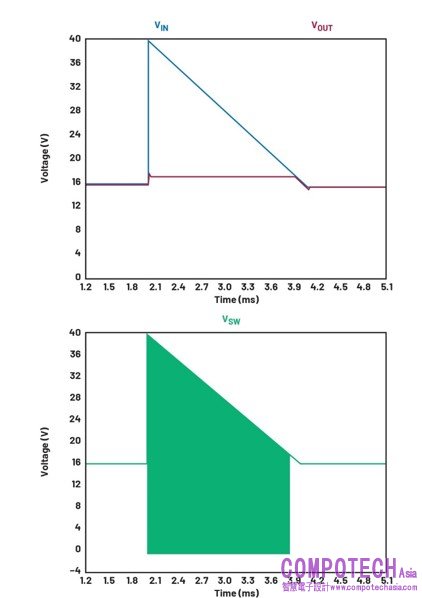 在圖3中,藍色顯示輸入電壓回應。正常輸入電壓為16 V。大約2 ms時,過壓達到40 V。紅色顯示輸出電壓隨時間的變化。在 VIN 過壓持續期間,開關DC-DC穩壓器啟動,將輸出電壓調節到16 V。綠色顯示區域為開關節點電壓(在MOSFET、蕭特基二極體和電感之間的節點處)。