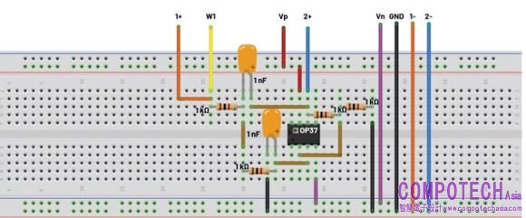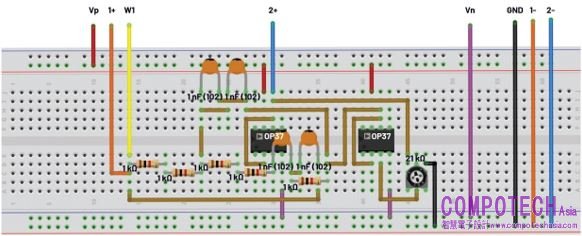 圖2. Sallen-Key二階低通濾波器試驗板連接