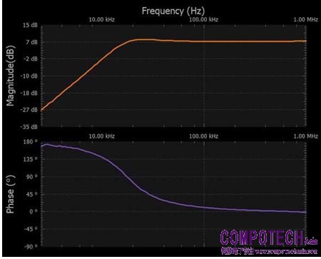將通道1設定為參考。將幅度設定為200 mV,偏置設定為0 V。在顯示設定下,將幅度設定為-35 dB至+5 dB,相位設定為-180°至+180°。將樣本計數設定為100。重新打開電源,並運行從7.5 kHz到1 MHz的頻率掃描。參見圖9。