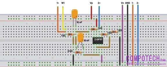 圖5. Sallen-Key二階高通濾波器試驗板連接