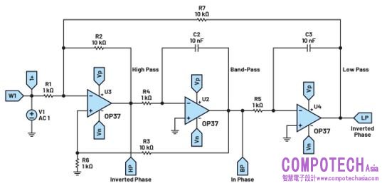 狀態變數濾波器配置可以準確實現濾波器功能,但其代價是電路元件數量大增。全部三個主要參數(增益、Q和fr)都可以單獨調節,同時提供低通、高通和帶通三種輸出。陷波和全通濾波器也可以使用狀態變數濾波器進行配置。利用增加的放大器 部分對低通部分和高通部分求和,還可以整合陷波功能。透過從輸入端減去帶通輸出,利用四個放大器配置也可以建構全通濾波器。圖10所示的是輸出低通、高通和帶通頻率響應的狀態變數濾波器配置。