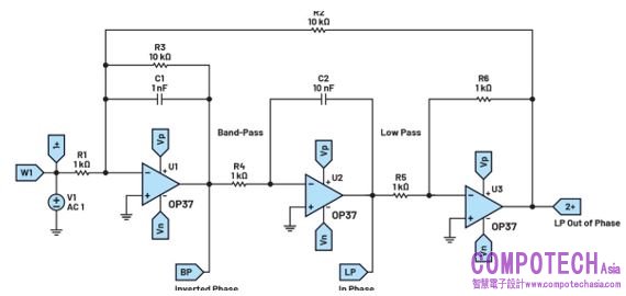 如果仔細觀看,就會發現Tow-Thomas濾波器配置是對狀態變數濾波器略微重新調整的結果。其沒有單獨的高通輸出,但會產生兩個低通輸出(一個同相和一個錯相),以及一個反相的帶通輸出。每個輸出的連接如圖13所示。然而,在目前濾波器配置中增加第四個放大器後,就可以得到高通、陷波或全通濾波器。全通濾波器為電路增加了相移響應特性,同時訊號幅度不受影響。其為所有頻率提供單位增益。