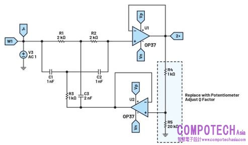 訊號回饋由電阻R4和R5提供,R4和R5決定濾波器的Q值和陷波深度。品質因數由公式9確定。