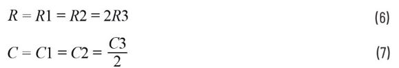 雙T陷波濾波器電路由兩個T形網路組成:一個RCR T網路和一個CRC T網路。電阻R1和R2與電容C3構成RCR T網路,而電容C1和C2與電阻R3構成CRC T網路。設計配置如公式6和公式7所示。