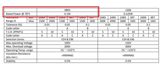 舉個例子:TE的RN73系列的0805型電阻,根據規格手冊,其額定功率為 0.1W(RN73系列規格手冊)。