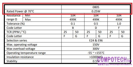TE的新款RP73P系列的0805型電阻,根據規格手冊,其額定功率可以達到0.25WC