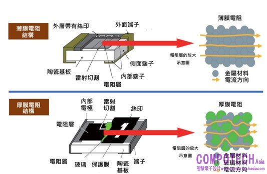 圖2:薄膜電阻和厚膜電阻結構的差異(圖片來源:Yageo)