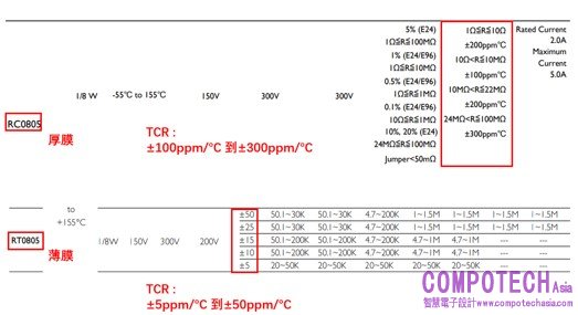RC0805,厚膜,0805,TCR的範圍±100ppm/℃到±300ppm/℃(RC0805規格手冊)。