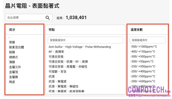 DigiKey網站有不同品牌的薄膜電阻與厚膜電阻,提供豐富的參數篩選項,如成分、溫度係數等各種參數。工程師可以根據應用要求和參數來挑選合適的電阻。