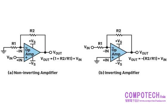 圖1.單端(a)同相放大器和(b)反相放大器。