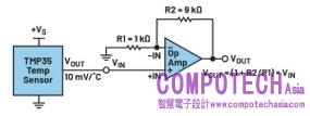 圖2.單端溫度感測器輸出和同相放大器電路。