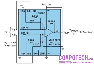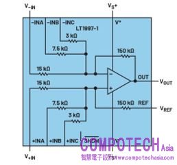 圖4.LT1997-1整合差動放大器(針對10 V/V的增益配置)。