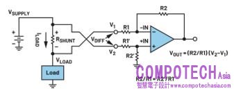 對於高邊差模電流感測,必須考慮兩個電壓:差模電壓(VDIFF),即輸入V2和輸入V1之間的訊號電壓(分流電阻上的電壓);還有共模電壓(VCM),存在於V2和V1上。在此示例中,運算放大器的+IN輸入為電壓VSUPPLY(或VLOAD + VDIFF),運算放大器的–IN輸入為電壓VLOAD(或VSUPPLY – VDIFF)。差動放大器將放大差模電壓並抑制共模電壓。