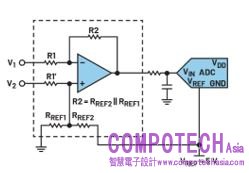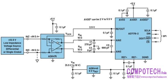 圖13.全差分放大器驅動高精度ADC(參考電路筆記CN-0310)。