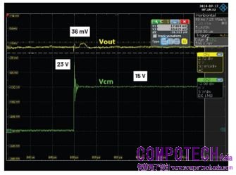 圖9顯示了ADI 的AD8418 CSA所實現的階躍響應和瞬態抑制。共模輸入電壓為15 V,放大器的輸入瞬變過沖共模電壓超出50%。產生的共模階躍響應表現為僅36 mV的短暫輸出擾動。