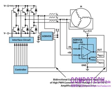 舉個例子,在典型的三相電機控制系統中測量相位電流時,會發生共模電壓快速切換,在該場景中,控制器將脈寬調變(PWM)訊號驅動到逆變器級,然後逆變器級驅動馬達的每一側(圖10)。分流電阻與馬道並排放置。利用分流電阻上暫態電流測量的差模電壓回饋,控制器能夠確定每個訊號的相位。透過每個PWM脈衝,分流電阻上的共模電壓在V–和V+之間的整個電源電壓範圍內快速步進。這些快速PWM步進要求放大器具有高頻寬,且能夠在升緣和降緣抑制高瞬態過沖。ADI的AD8411A在輸入端整合了共模電壓範圍高達70 V的精密內部電阻分壓器網路,採用2.7 MHz高頻寬,並包含去突刺電路,以透過降低快速開關輸入訊號的影響來實現輸出精度,因此非常適合此類應用。