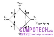 相較於儀錶放大器,差動放大器的一個潛在侷限是輸入阻抗相對較低。另一個侷限是每個放大器輸入的阻抗不相等。要瞭解這些侷限的影響,可參考惠斯通電橋(圖11)中的差模訊號(V2 – V1)放大,這種配置廣泛用於各種感測器。首先要考慮的是,許多電橋的輸出阻抗較高,卻要驅動相對較低的放大器輸入阻抗,這可能是個問題。例如,當電橋輸出阻抗為4 kΩ,差動放大器輸入阻抗為200 kΩ時,其輸出阻抗上將損失2%的感測器訊號,這將導致測量精度降低。第二個要考慮的是,差動放大器的輸入阻抗不相等,這將導致電橋電路兩側的壓降不同,進而產生差模電壓誤差。為了解決這些問題,所使用的放大器需要具有更高的輸入阻抗,在電橋輸出上呈現平衡負載,並具有卓越的CMRR。這些都是儀錶放大器的主要特性和優點。