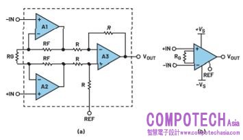 圖12.(a) 3運算放大器儀錶放大器拓撲和(b)單晶片儀錶放大器積體電路。