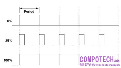 圖2. 工作週期為0%、25%和100%的脈衝序列