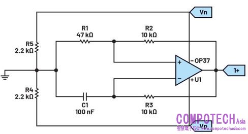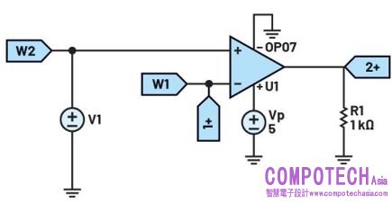 為運算放大器提供+5 V電源電壓。配置示波器,使通道1上顯示輸入訊號,通道2上顯示輸出訊號。