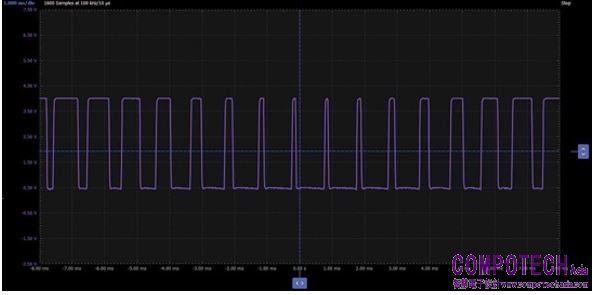 輸出訊號是輸入電壓的PWM表示。請注意,透過改變電位計值,訊號工作週期會發生變化,而頻率保持不變。